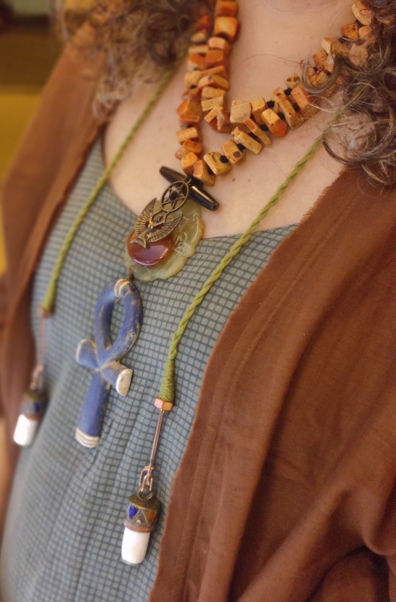 Rooted in ancient Egyptian symbolism, Eternal Life celebrates rebirth, power, and the sacred feminine. A striking blue ankh - the symbol of life — anchors this handcrafted piece, suspended beneath a winged goddess and a carved stone medallion. The warm hues of jasper beads meet serene jade and lapis, connected through green woven cords and copper accents.