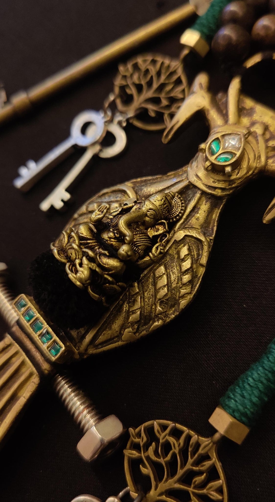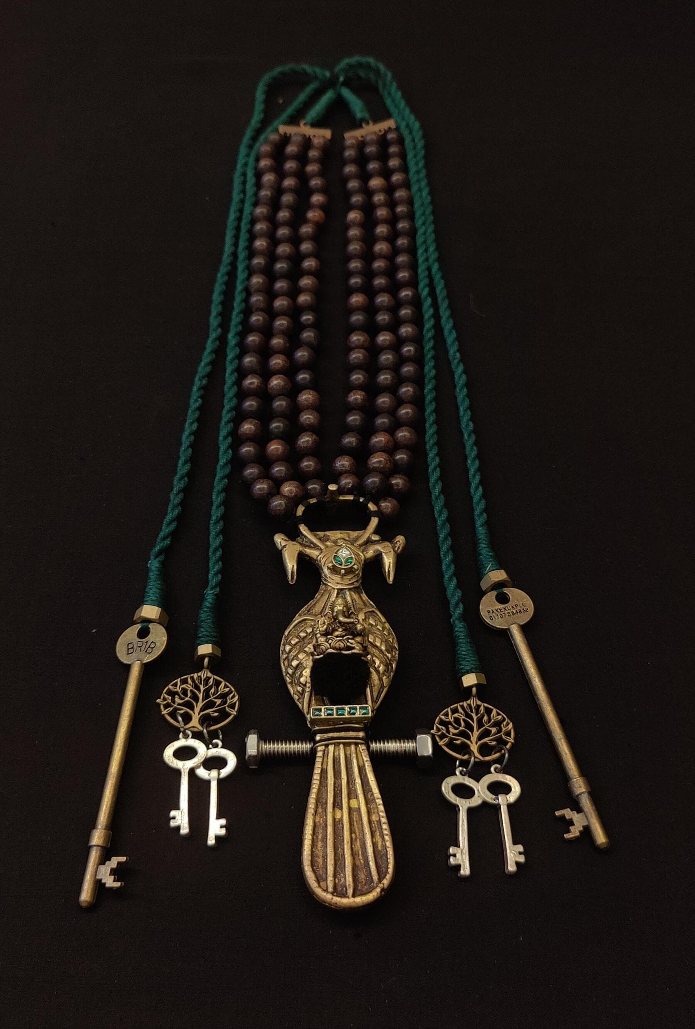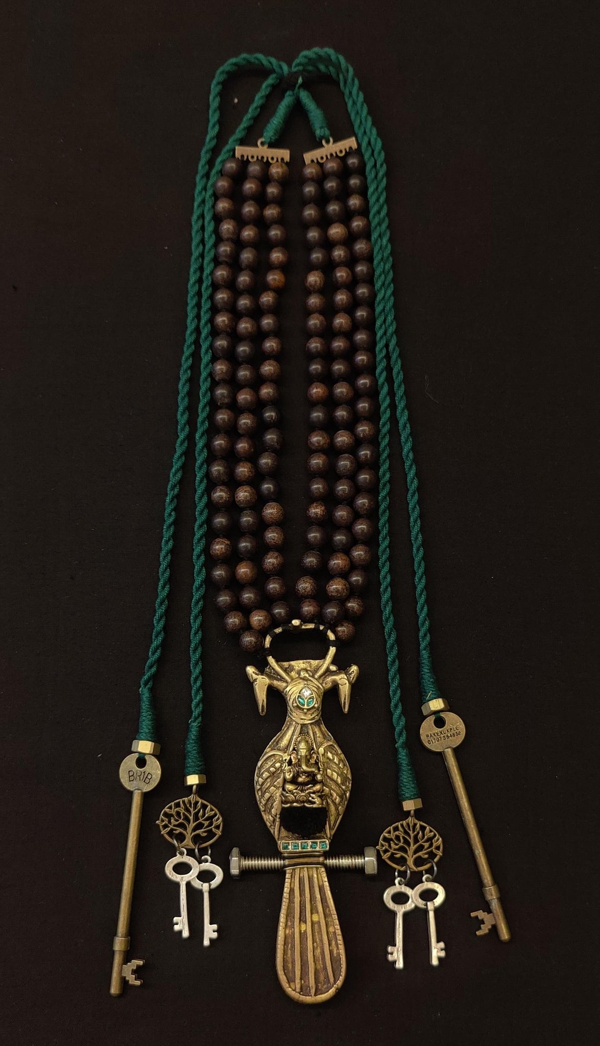This necklace centers on a sculpted brass Ganesh within an intricate bird motif. Flanked by antique keys and Tree of Life charms, the tassels carry symbols of wisdom, protection, and new beginnings. Deep green cords meet rows of polished wooden beads, making this piece both a talisman and a statement.
