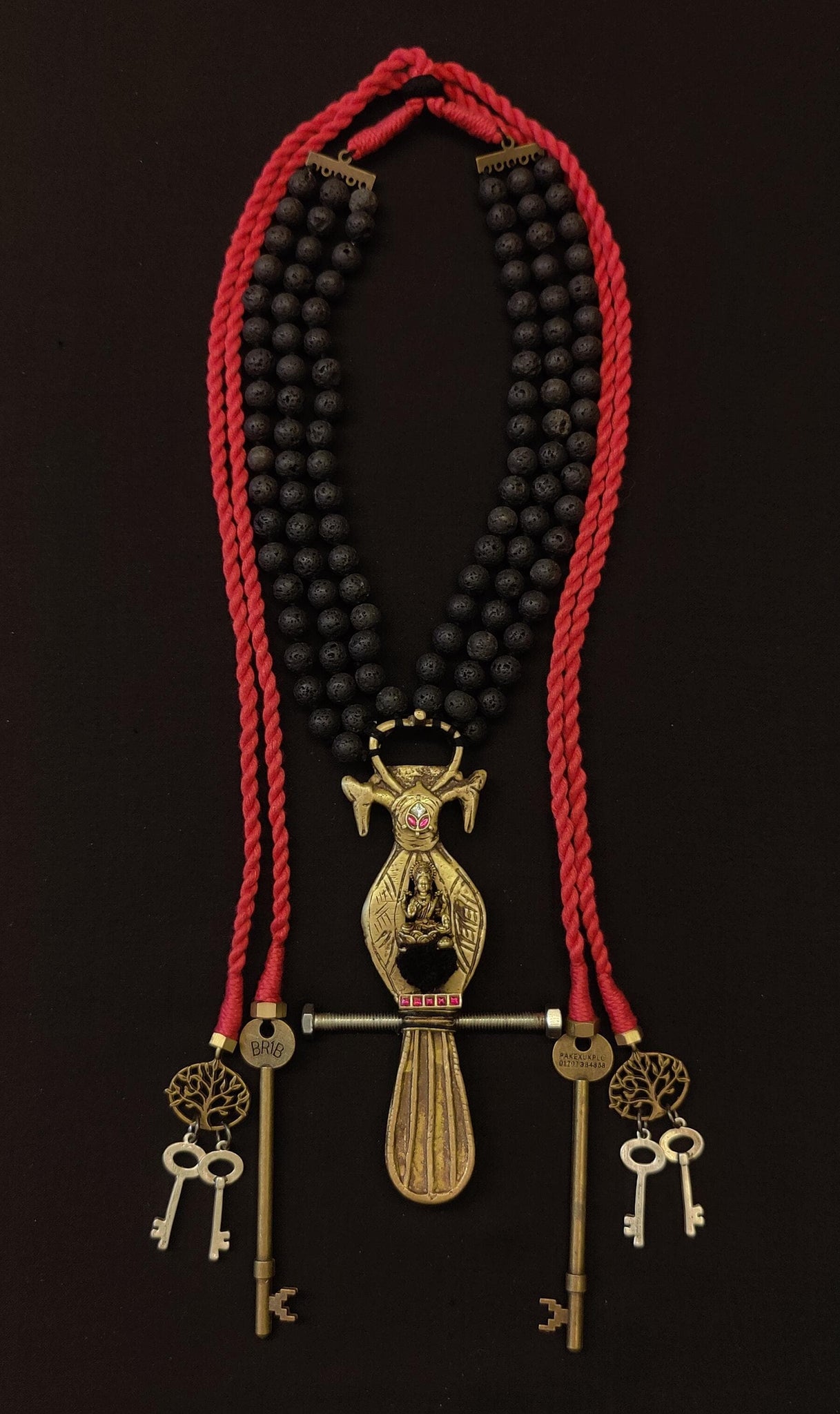 This bold statement necklace features a central brass pendant with Goddess Lakshmi seated in blessing, surrounded by ancient-style engravings. Black beads and rani pink cords add contrast and strength, while vintage keys and tree charms symbolize protection and renewal. A powerful piece that weaves divinity, craftsmanship, and symbolism into one striking design.