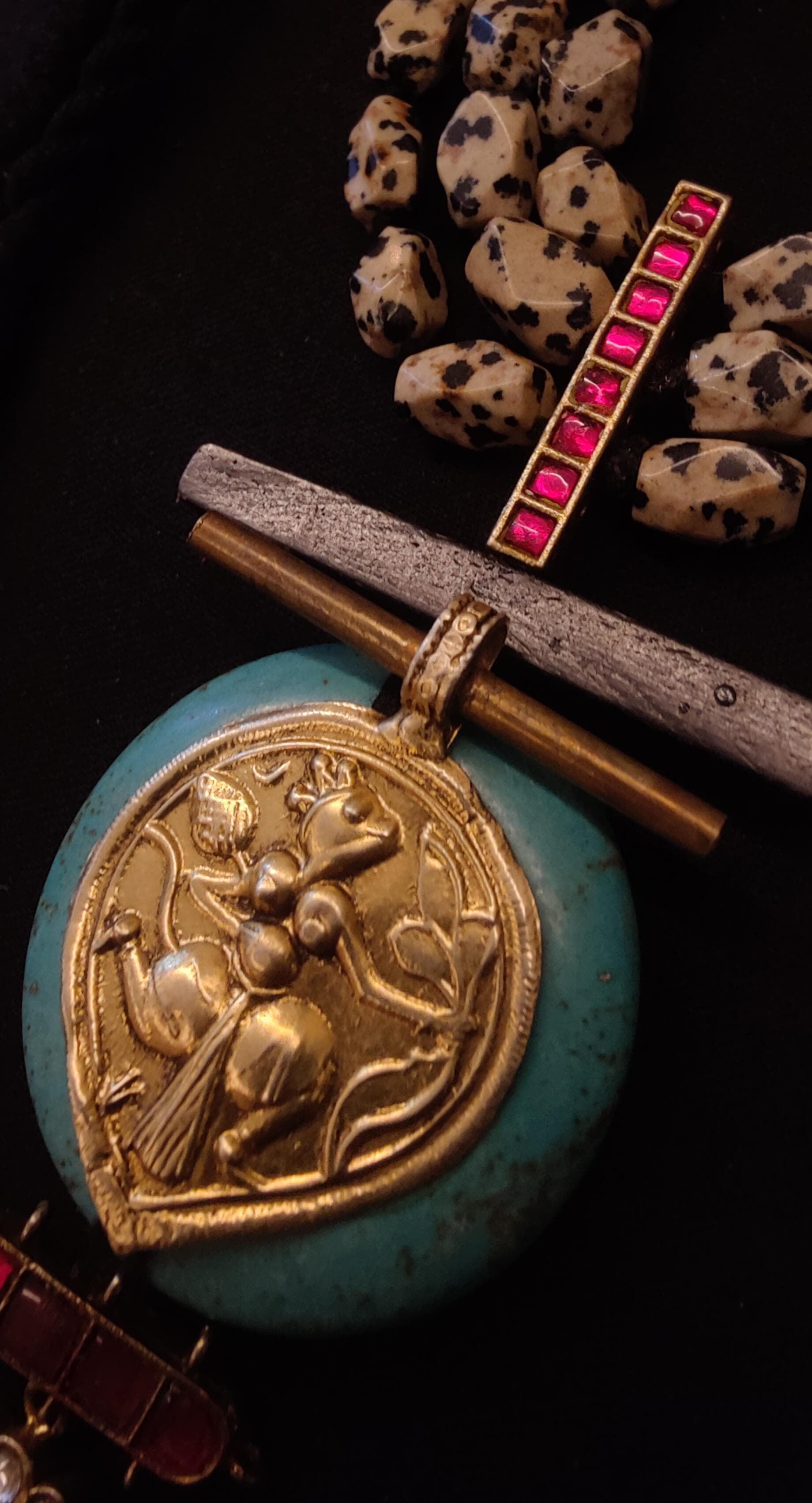 The necklace consists of multiple strands of small, speckled, off-white beads strung together. These strands are connected to a thick, black cord on either side. The main pendant is a large, round turquoise bead. It is framed in gold plated silver motif which features an embossed deity or mythical creature. Suspended below the main pendant is a smaller, ornate, brass kundan piece adorned with multiple small, pink or red gemstones.
