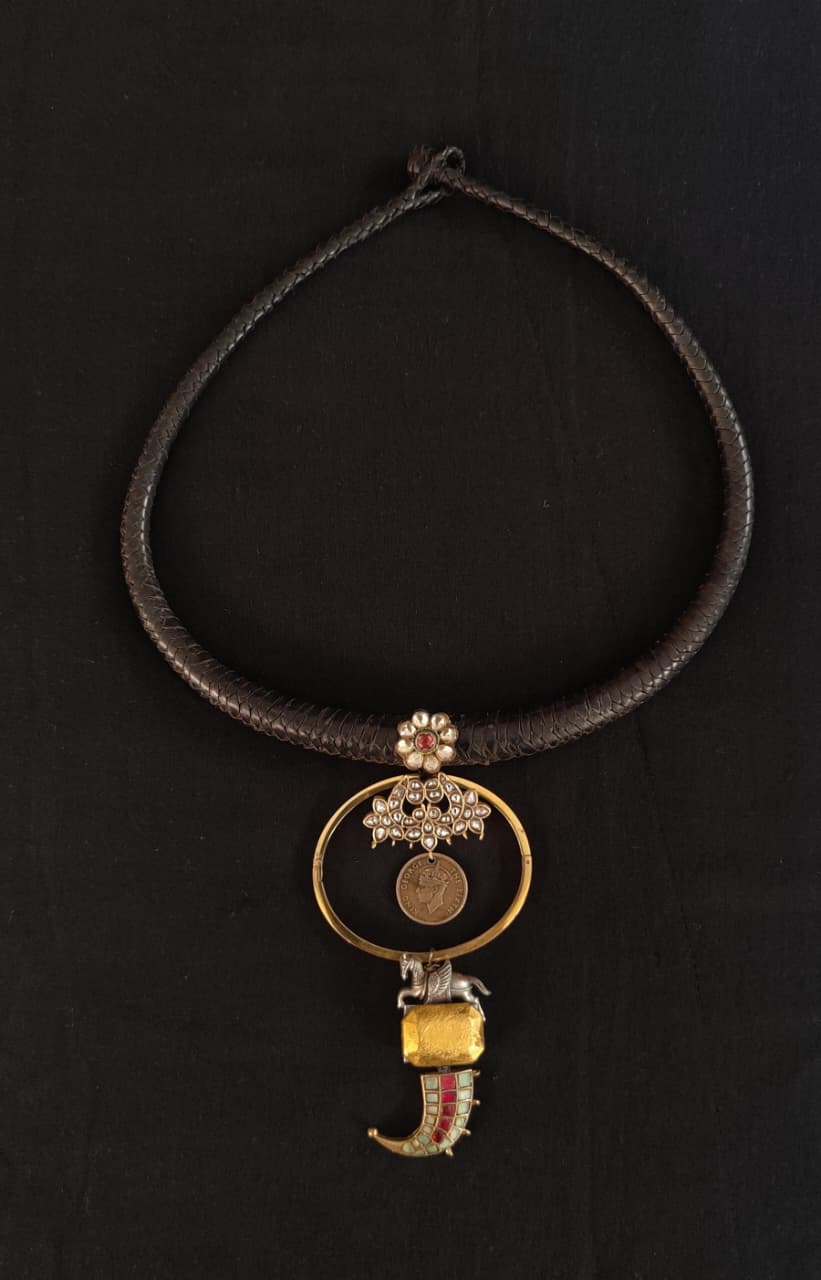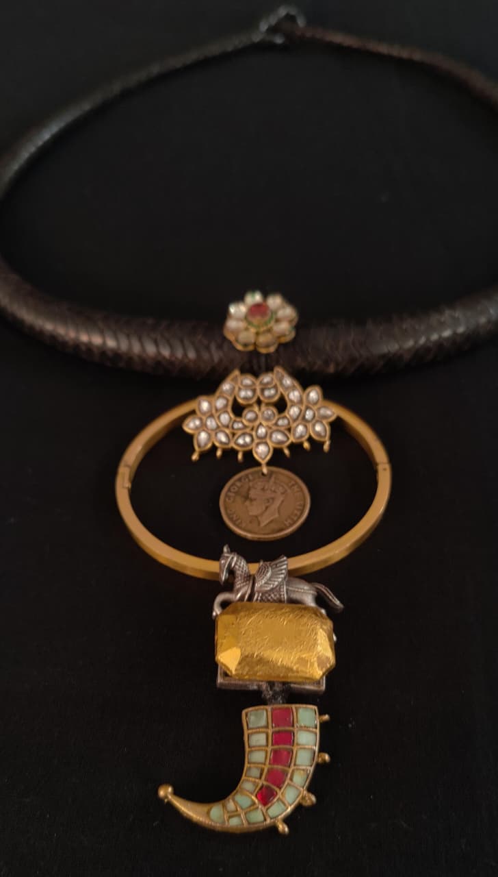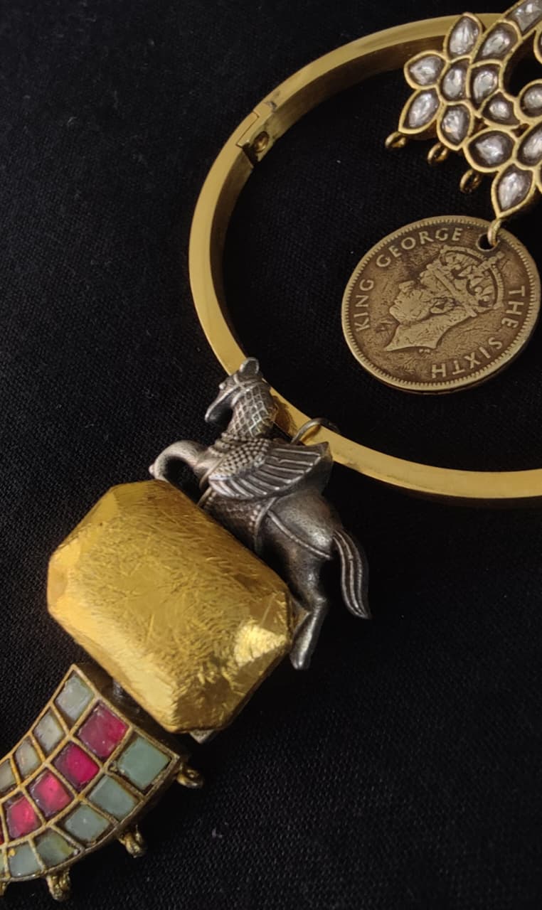 This striking handcrafted necklace is a unique celebration of heritage, mythology, and artistry. Centered on a vintage British colonial coin featuring King George VI, the pendant evokes echoes of history and empire. The coin is set within a brass circle, crowned with a floral brass motif studded with stones, a touch of regal elegance.