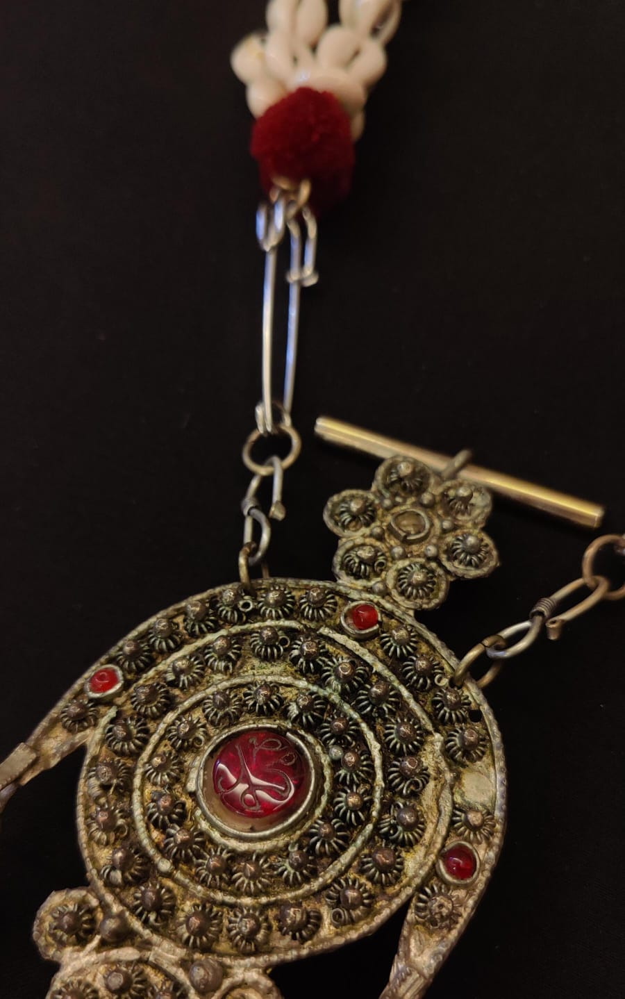 Rooted in tradition and handcrafted with care, this necklace brings together natural cowrie shells and a vintage tribal pendant. The three strands of shells are bound with handwoven red thread, leading to an intricately detailed pendant with antique silver tones. A central stone, rustic chains, and charms shaped like keys and hearts add layers of storytelling and symbolism.