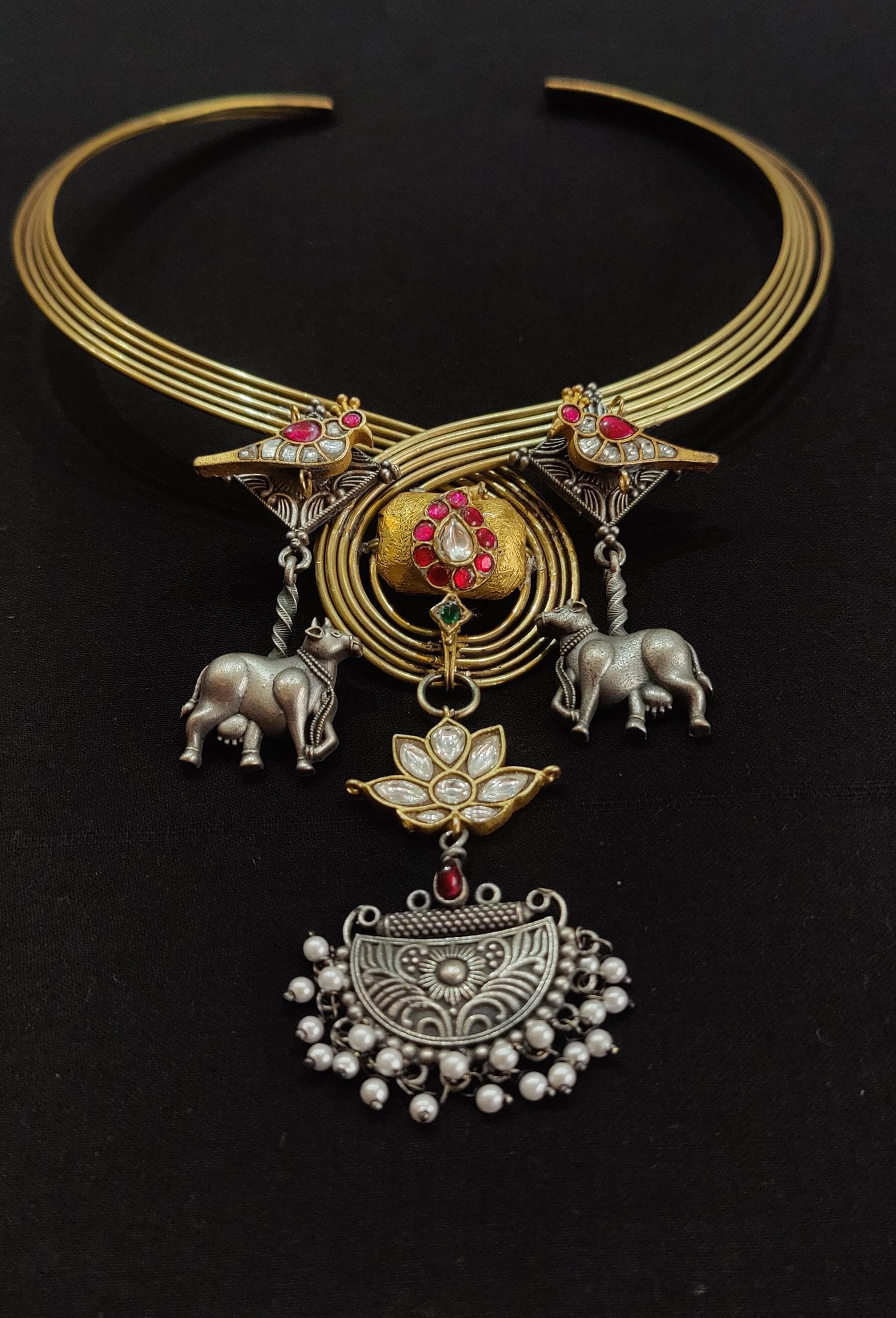 At the centre sits a domed pendant crowned with a floral design and suspended with a grand, bell-shaped drop, detailed with ethnic carvings and delicate beadwork. The fusion of gold and oxidized silver tones brings depth and character to the piece, making it an eye-catching choice for cultural gatherings, festive wear, or statement styling.