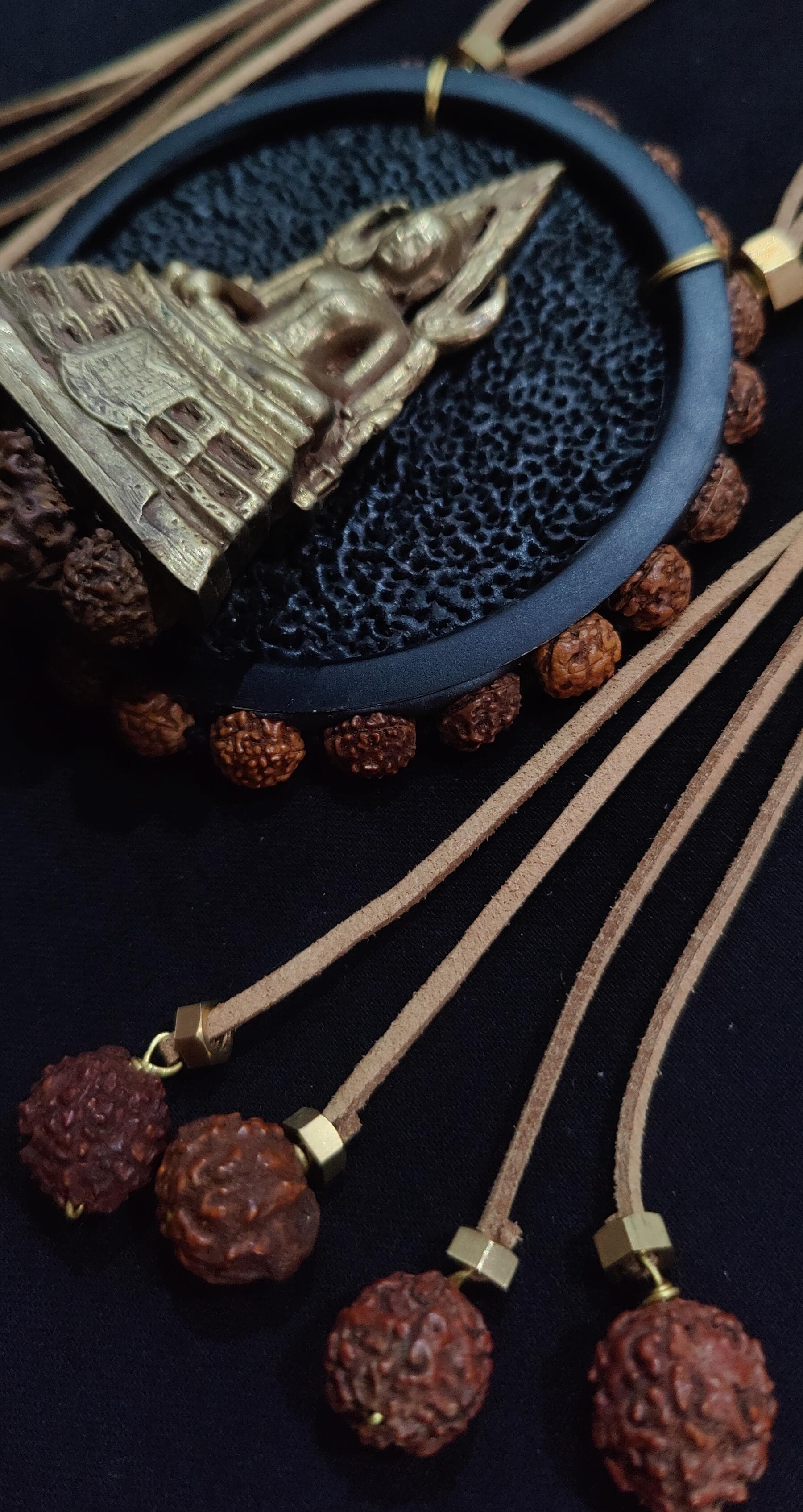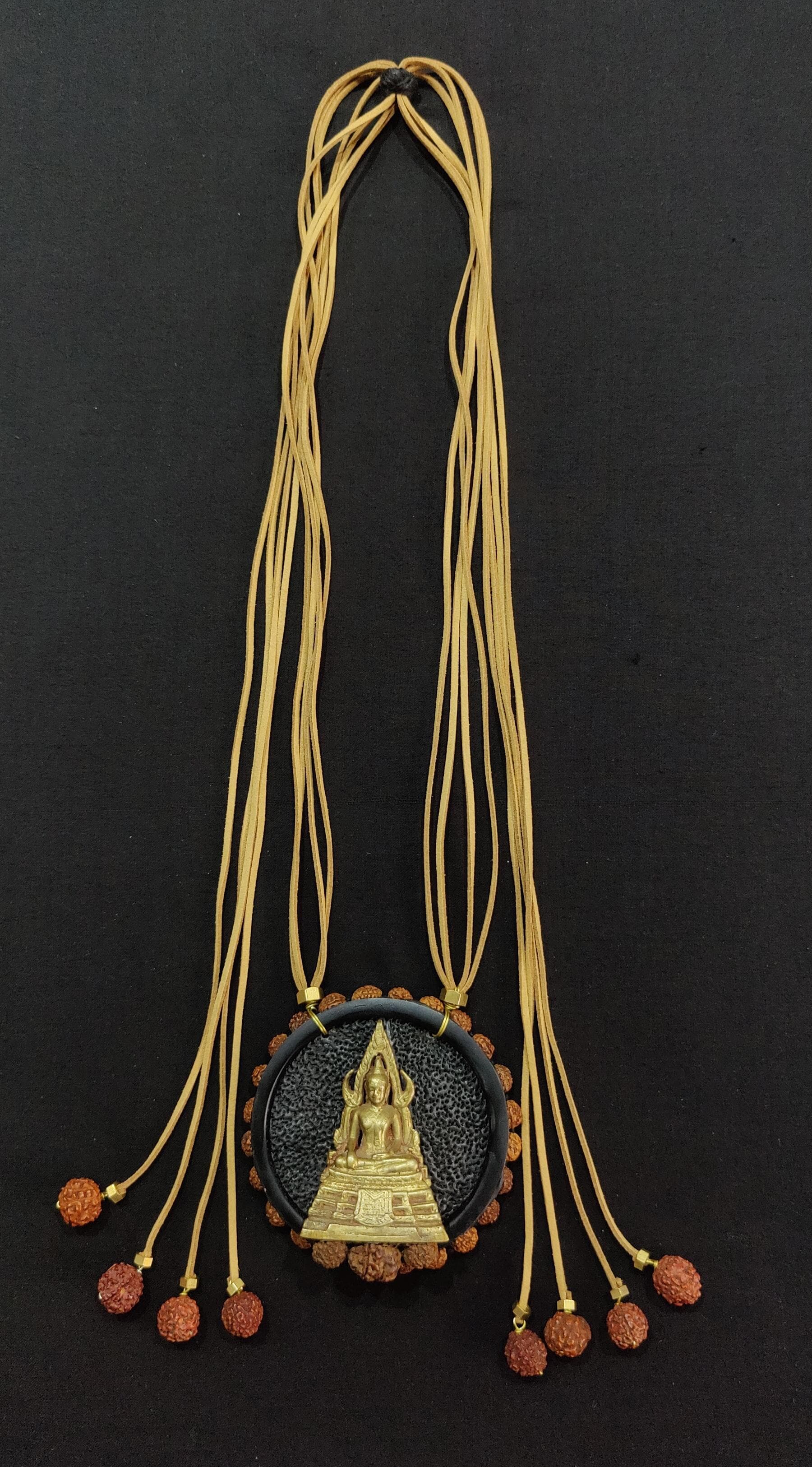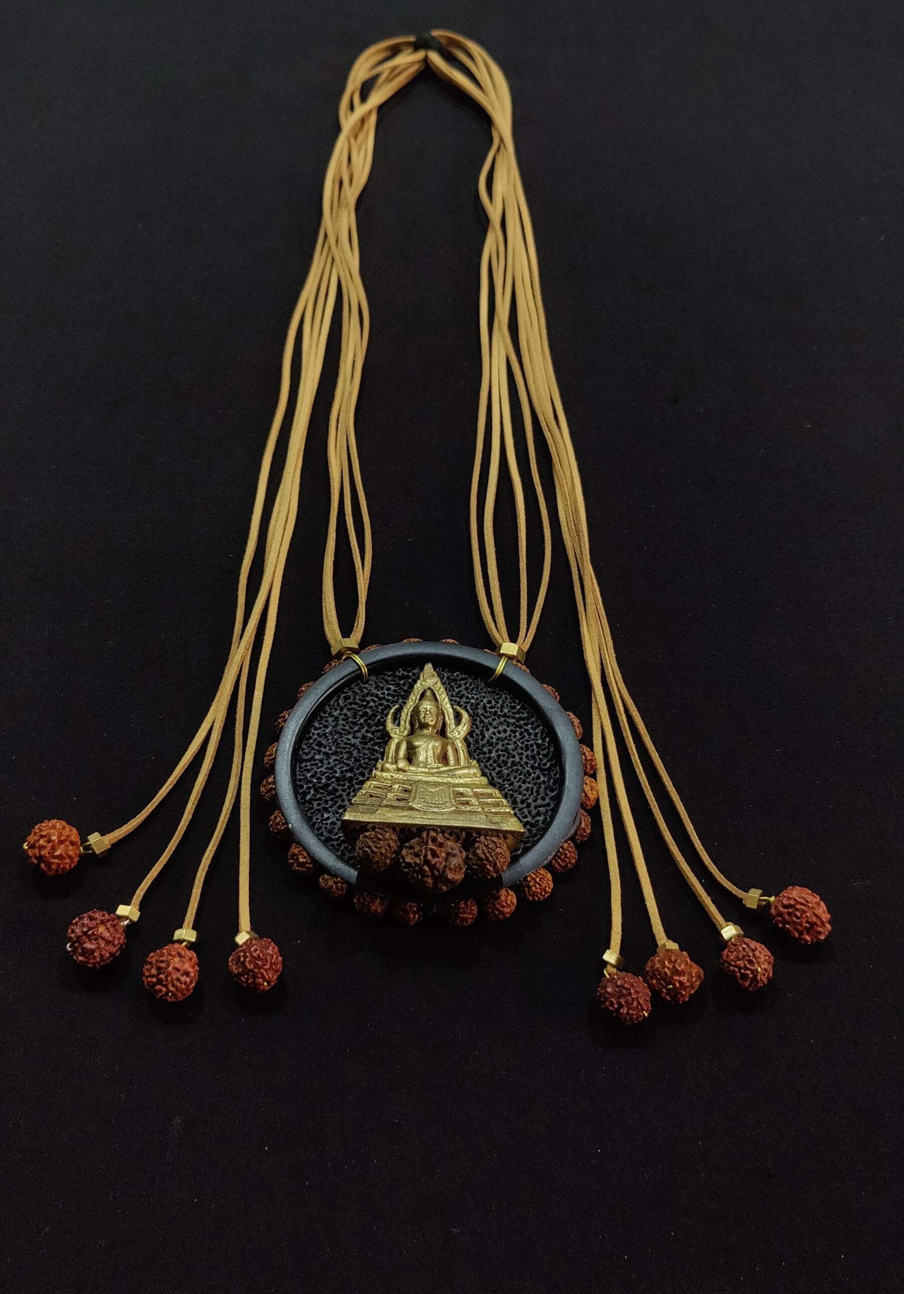 A circular frame encasing a finely carved Ganesh, bordered by rudraksha beads and suspended on mustard cords. Rooted in spirituality, this necklace is both meditative and elegant, perfect for those who seek beauty with meaning.