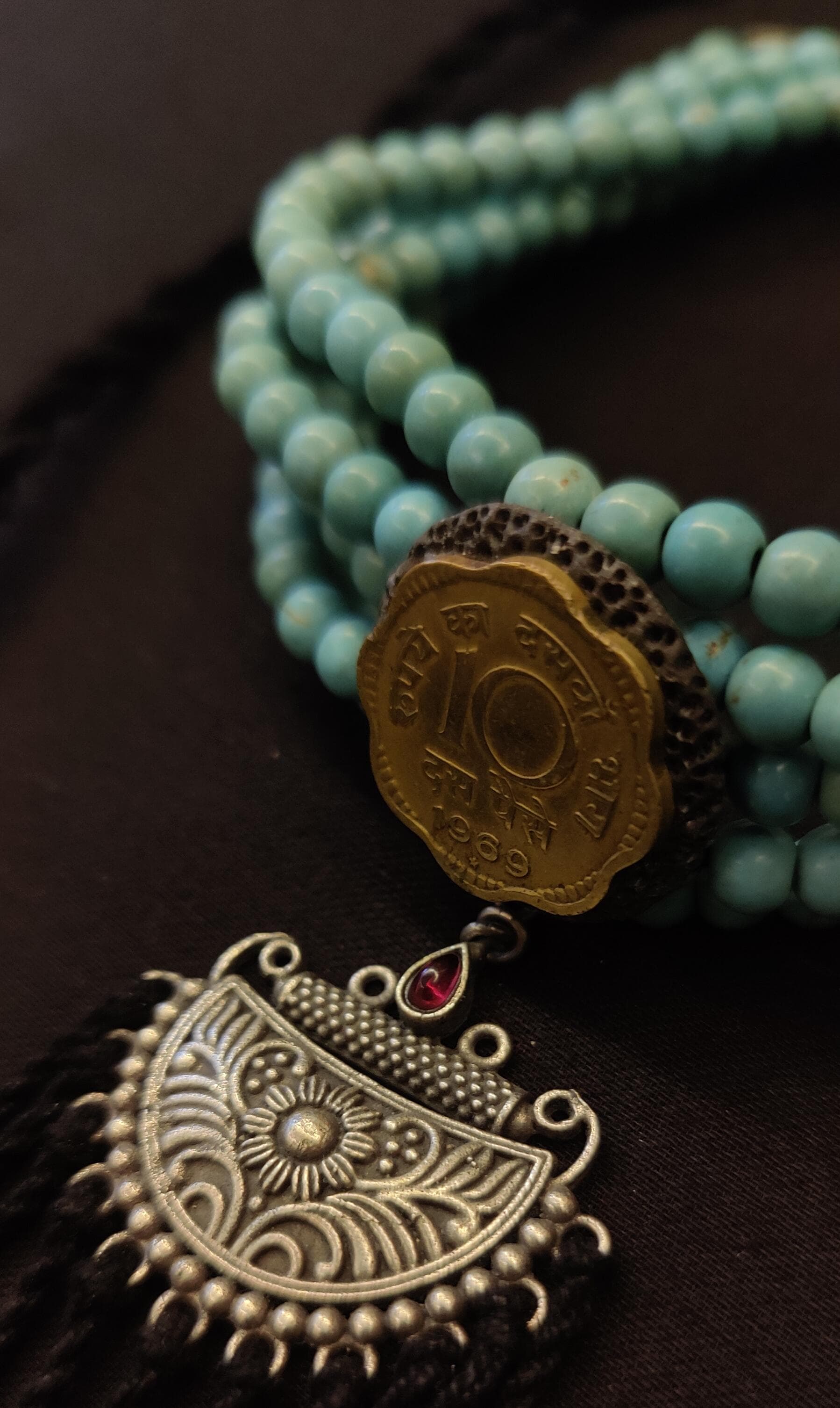A captivating blend of color and texture, this necklace features three strands of turquoise beads anchored by a vintage coin and an ornate silver pendant. Black hand-braided cords extend below, finished with cascading brass washers that add movement and modern edge. A unique composition that marries traditional motifs with contemporary design sensibility.